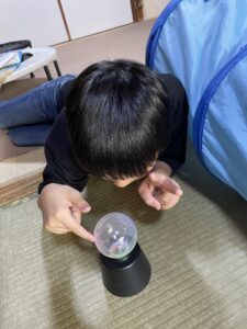 触ると中のプラズマがスッと伸びてくるだけなのですが、不思議な現象に興味津々になりながら、暗いところに持って行ったりして遊んでくれました😄