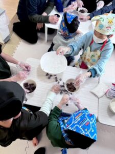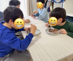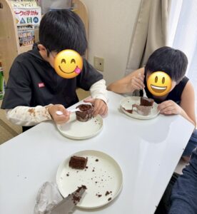 職員が最後に焼き、完成したガトーショコラをみんなで食べました❗️とても美味しそうに食べており「おかわり☺️」と言う声を聞こえ、みんな嬉しそうな表情でした😄