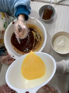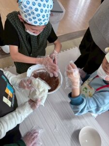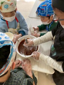 みんなでチョコを溶かした後にバターやホットケーキミックスで混ぜて生地を作りました🍫
